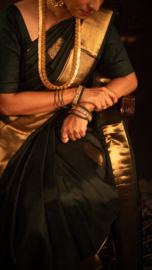 A luxurious Kanjivaram CHIC PIECE TARA, The sari’s vibrant yellow-green color and intricate detailing exemplify the elegance and cultural richness associated with traditional Kanjivaram saris. Known for their luxurious silk and heritage-inspired motifs, Kanjivaram saris often feature exquisite patterns such as paisleys or floral designs woven directly into the fabric, as seen here.